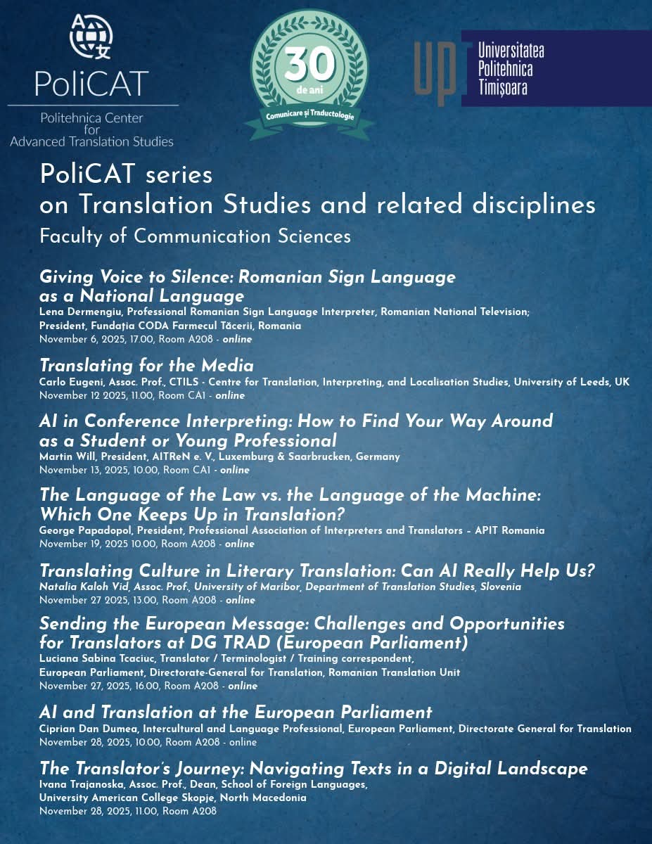 - Talk: Sending the European Message: Challenges and Opportunities for Translators at DG TRAD (European Parliament), Luciana Sabina TCACIUC, European Parliament