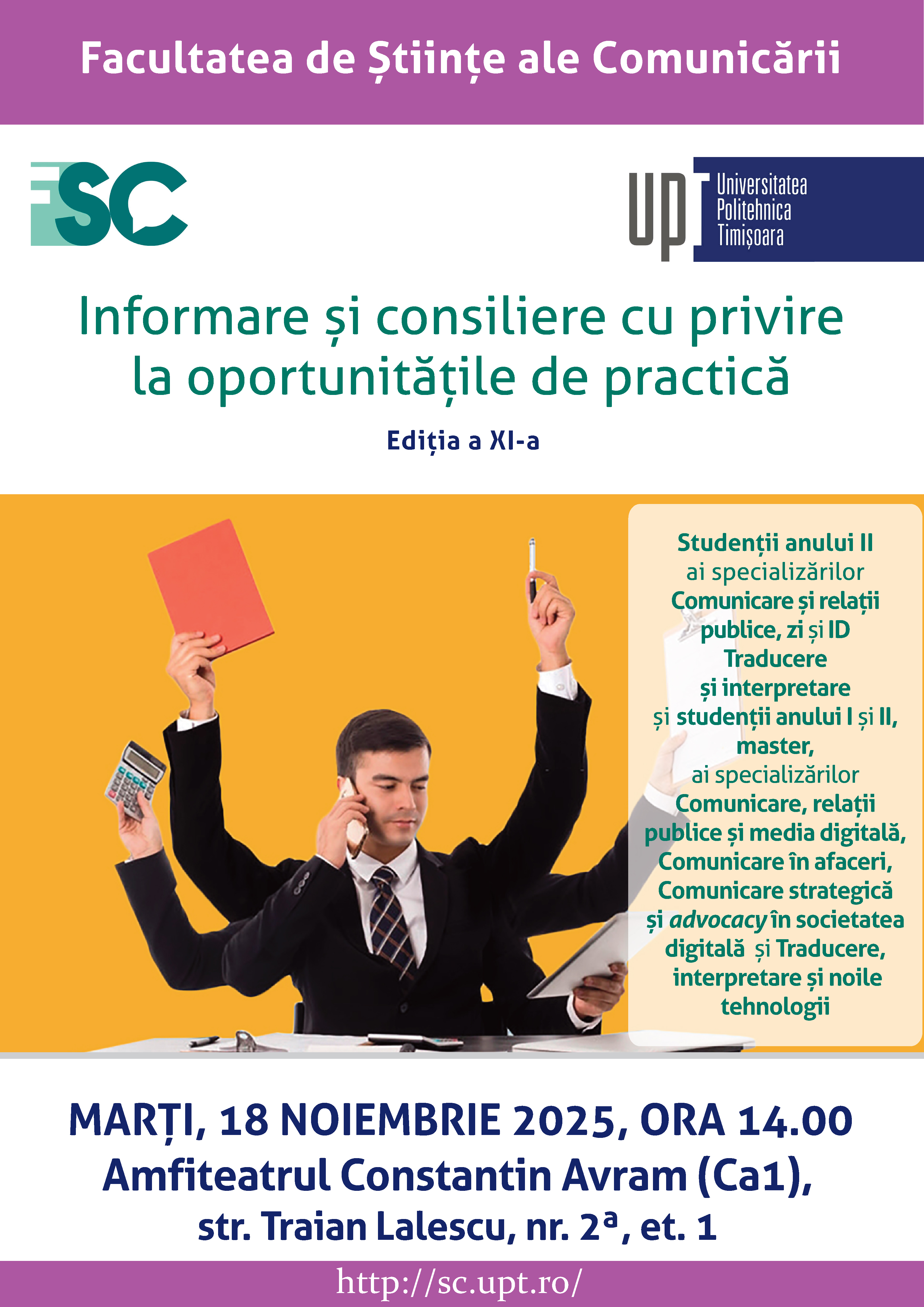 Marți, 18.11.2025, ora 14.00, în cadrul Zilelor Facultății de Științe ale Comunicării, Facultatea de Știinte ale Comunicării organizează ediția a XI-a a Sesiunii de informare și consiliere cu privire la oportunitățile de practică în companiilor și institutiilor din Timișoara. Vor participa studenții anului II, ciclul licență, specializările Comunicare și relații publice (zi și ID) și Traducere și interpretare (engleză; franceză/germană), și studenții anului I și II, ciclul master, specializările Comunicare, relații publice și media digitală, Comunicare în afaceri, Comunicare strategică și advocacy în societatea digitală și Traducere, interpretare și noile tehnologii. Evenimentul va avea loc în Amfiteatrul Constantin Avram (Ca1) (str. Traian Lalescu 2A, et. 1).