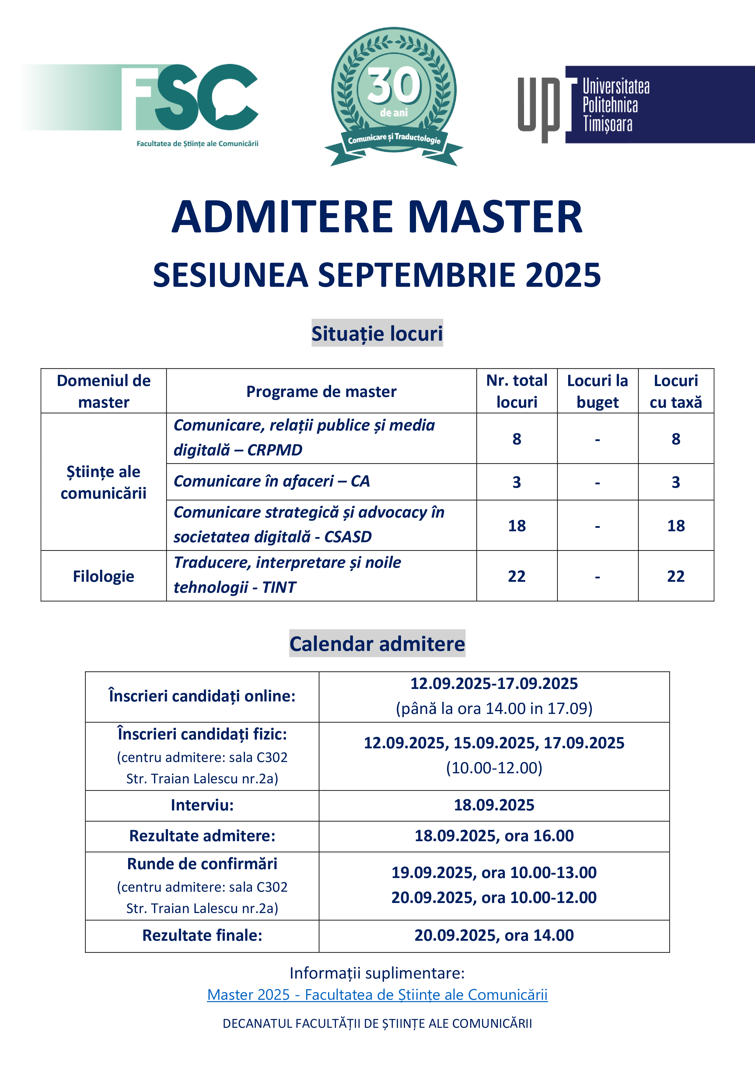 Facultatea de Ştiinţe ale Comunicării din cadrul Universităţii Politehnica Timişoara organizează concurs de admitere, în anul universitar 2025-2026, la programele de studii universitare de master, astffel: