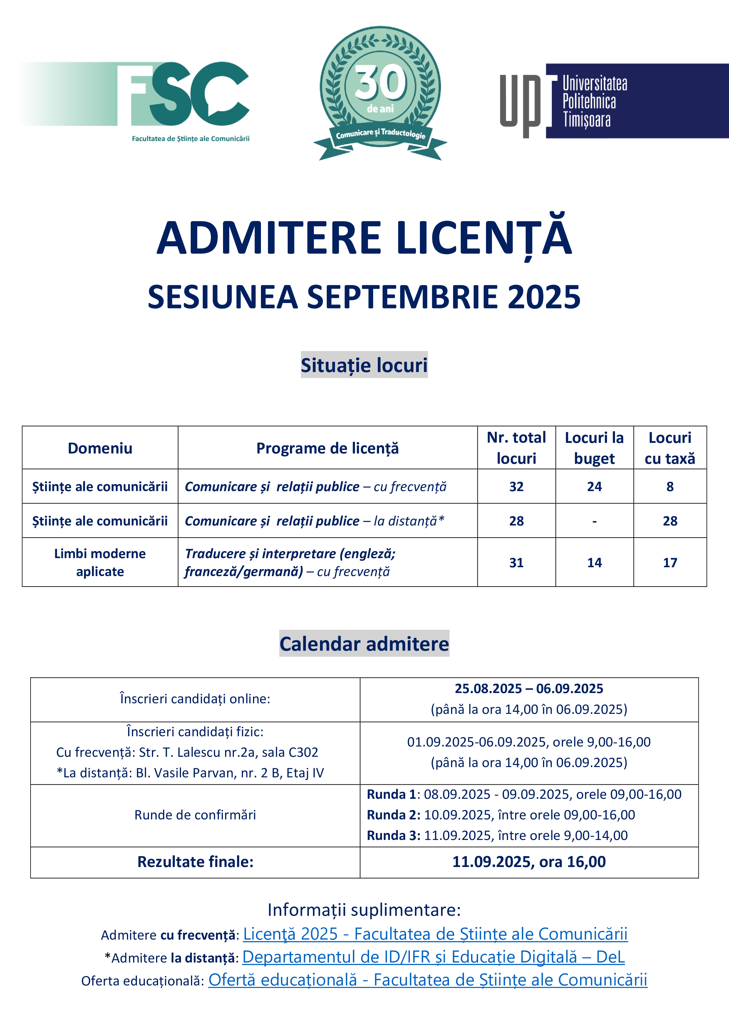 Facultatea de Științe ale Comunicării organizează, în sesiunea septembrie 2025, admitere de toamnă, conform calendarului de mai jos. Mai multe informații se găsesc la pagina Licenţă 2025 - Facultatea de Științe ale Comunicării.