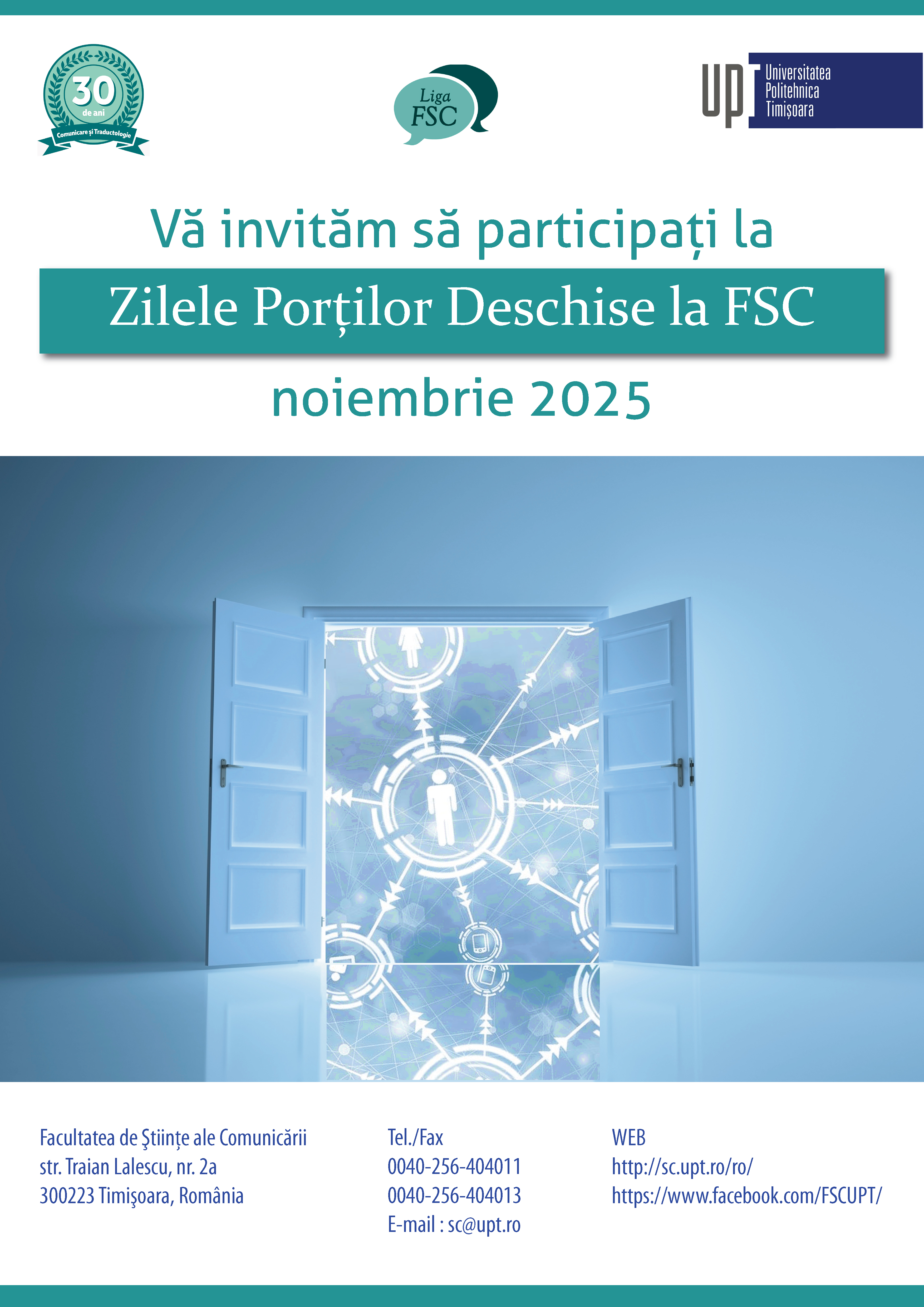 Facultatea de Științe ale Comunicării din Universitatea Politehnica Timișoara vă invită să participați la activitățile desfășurate cu ocazia Zilelor Porților Deschise la FSC, organizate în luna noiembrie 2025, în cadrul Zilelor Facultății de Științe ale Comunicării.