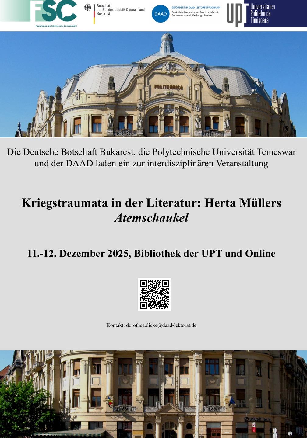 Facultatea de Științe ale Comunicării din cadrul Universității Politehnica Timișoara a găzduit conferința internațională „Kriegstraumata in der Literatur: Herta Müllers Atemschaukel”, organizată în parteneriat cu Serviciul German de Schimb Academic (DAAD) și cu Ambasada Germaniei la București.