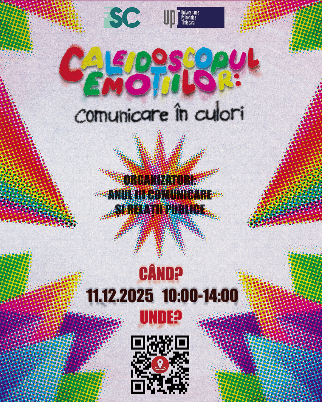 O nouă provocare marca #ExpoCRP a mobilizat, in 11 decembrie, studenții programului Comunicare și relații publice din cadrul Facultății de Științe ale Comunicării. Caleidoscopul emoțiilor: comunicare în culori a fost evenimentul care a făcut neîncăpător holul noii clădiri a Facultății de Inginerie Chimică, Biotehnologii și Protecția Mediului în intervalul 10:00–14:00.